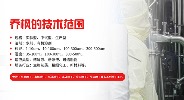 上海喬楓實業有限公司,成立于2012年,是從事噴霧干燥設備的研發設計、生產、銷售(小型噴霧干燥機,實驗型噴霧干燥機,35℃低溫噴霧干燥機,有機溶劑噴霧干燥機,低溫閉式循環噴霧干燥機超細粉末噴霧干燥機、噴霧冷凍干燥機、真空噴霧干燥機、氣流噴霧干燥機,噴霧造粒干燥機離心噴霧干燥機沸騰制粒機等)和售后于一體的綜合性公司,本公司現成為一家致力于為生物制藥、精細化工、新能源、陶瓷造粒及食品工程等領域提供全套解決方案的整線交鑰匙工程企業。